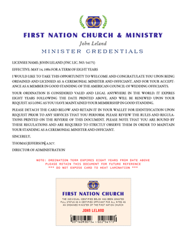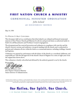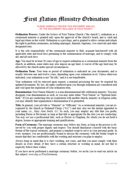 Your First Nation Ministry ordination credentials package includes all of the forms and documents required to legally perform all common rites, including weddings, vow renewals, memorials, baby blessings and other ceremonies.